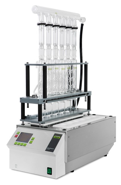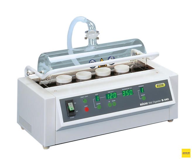 Дигестор B-440 — прибор для минерализации, снабженный программируемым термореле, стеклянным вытяжным колпаком и конденсатоуловителем, позволяющим осуществлять предварительное озоление примесей.