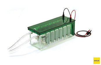 Электрофоретическая вертикальная камера большого формата, одновременное размещение до 12 гелей. Включает буферную емкость с охлаждающим сердечником, крышку, циркуляционный насос с трубками и 2 гелевых релизера.