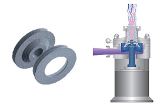 Модуль МКО (конусная мельница) имеет такой же принцип работы, как и модуль МК. Однако в наружной части конусы имеют шероховатое, износостойкое WCCO-покрытие. Вследствие этого образуется бóльшая поверхность трения, которая позволяет производить еще более тонкие суспензии при одновременном сокращении объема прохождения смеси.