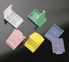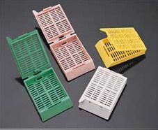 Кассеты изготовлены из полимера ацетата, имеют прорези (1х5 мм), через которые легко проникают не только соединения для проводки тканей, но и парафин. Используются для проводки и заливки тканей как в ручной, так и в автоматической технологии. Основа кассеты может служить блоком для закрепления материала в микротоме. Разноцветные кассеты удобно использовать для маркировки разных типов тканей.