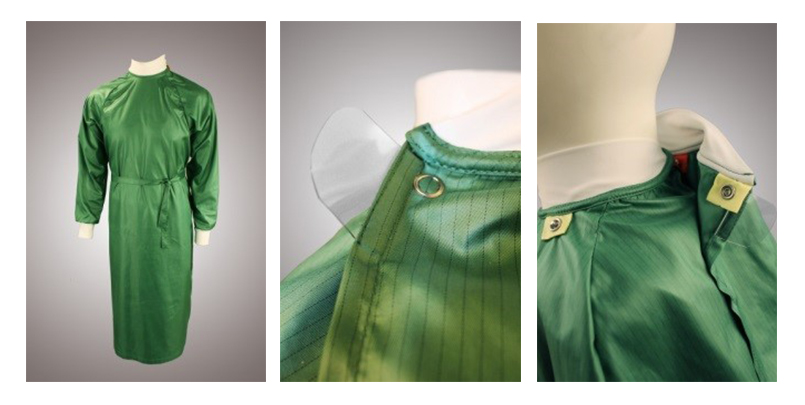 Халат регулируется по объему шеи с помощью кнопок. Удобный захват позволяет расстегивать изделие без соприкосновения с тканью. Воротник из безворсового трикотажного материала.