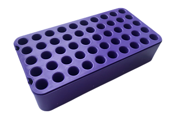 Цельнолитой штатив изготовлен из пластика с лунками, в которые помещаются пробирки/контейнеры, отличается высокой механической прочностью (ударопрочный пластик) и устойчивостью к воздействию химических реагентов. Благодаря своей конструкции штативы легко и прочно штабелируются, обеспечивая экономию пространства при хранении. Особенно подходит для компактного хранения резервных копий образцов. Блочный штатив удобно дезинфицировать, благодаря сквозным отверстиям в каждой лунке. Подлежит автоклавированию.