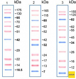 Содержат 11 белковых стандартов, три из которых (10, 40, 90 кДа) ковалентно связаны с голубым хромофором.