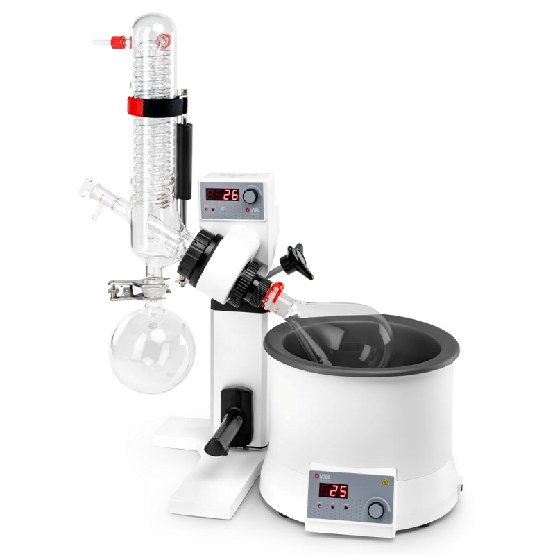 Ротационный испаритель RE100-Pro (аналог RV 3 V) является автоматической моделью с объёмом бани 5 литров и большим диапазоном температур до 180 °С. Благодаря специально сконструированным стеклянным направляющим, вертикальный конденсатор эффективно использует охлаждающую поверхность площадью 1000 см². Цифровой дисплей скорости вращения и температуры нагрева позволяет оптимально контролировать все процессы дистилляции. Запатентованное уплотнительное кольцо с двойной пружиной, изготовленное из ПТФЭ, обеспечивает превосходное уплотнение. Характеристики ротационного испарителя RE100-Pro