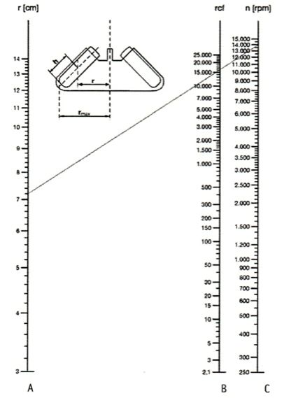 Пример: на шкале А отмечаем значение rрадиуса для ротора – 7,2 см, на шкале С отмечаем значение скорости ротора –14,000 об/мин, соединяем эти две точки. Точка пересечения образованного отрезка со шкалой В показывает значение ускорения для данного ротора. В данном случае ускорение равно 15’000.
