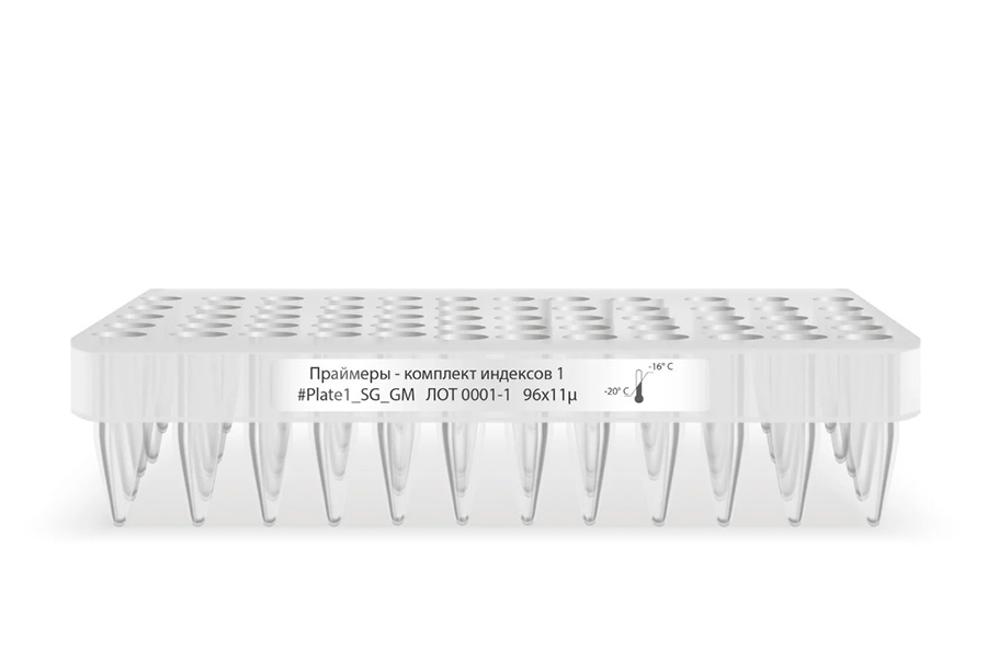 Планшет содержит 96 уникальных адаптеров с двойным индексом, расположенных вдоль колонок в 96-луночном планшете для ПЦР.